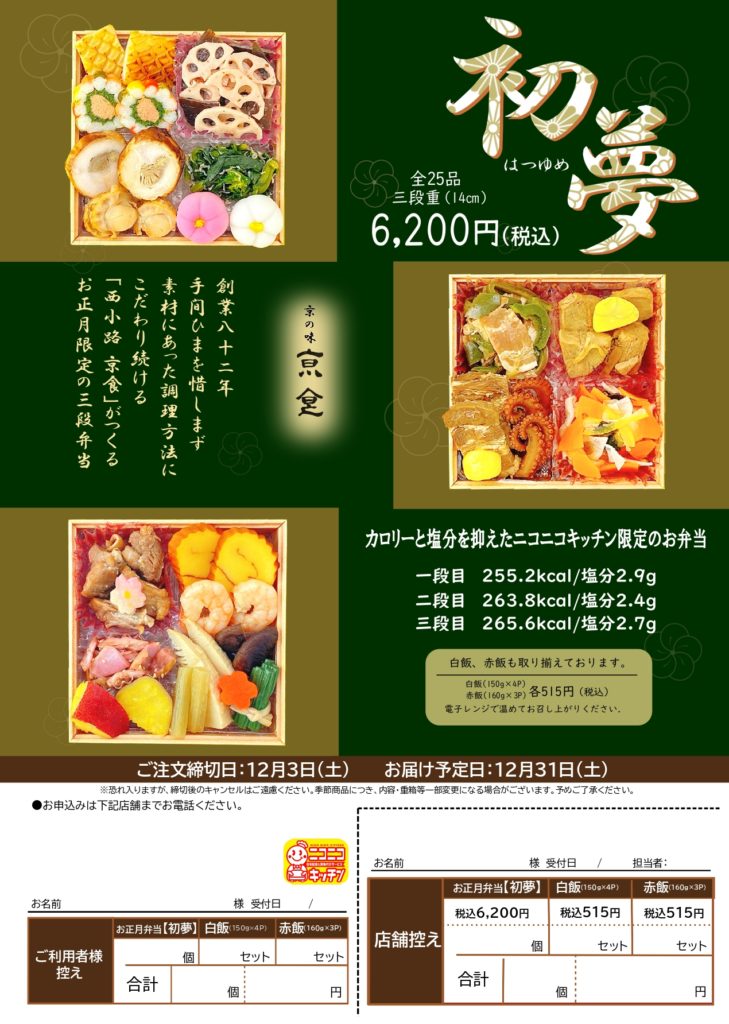 来年のお正月は是非ともニコニコキッチンのおせち弁当をよろしくお願いいたします。